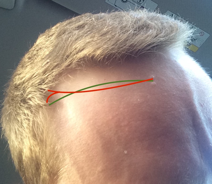 Habe auf den Bildern mal 2 Optionen eingezeichnet... Die eingezeichneten Linien sind allesamt oberhalb meiner Ursprünglichen Haarlinie! Die war ein paar mm unter dem unteren kleinen Knubbel