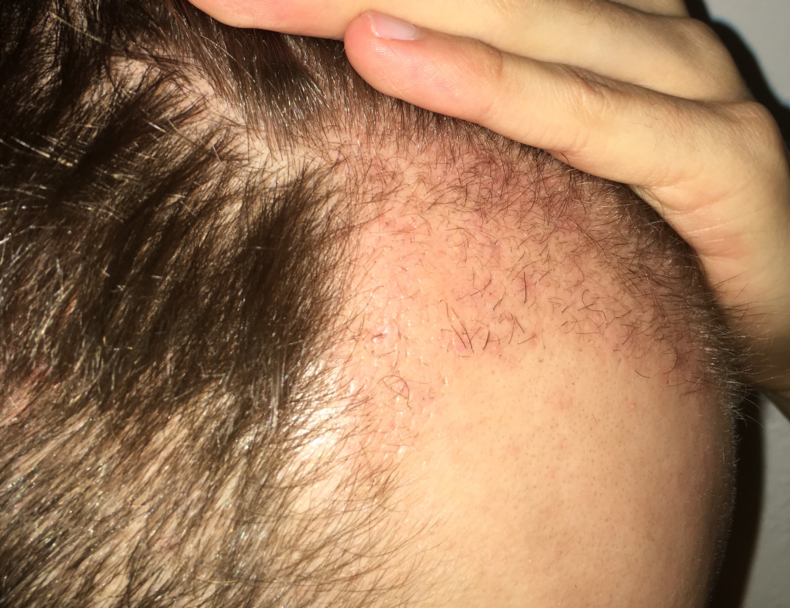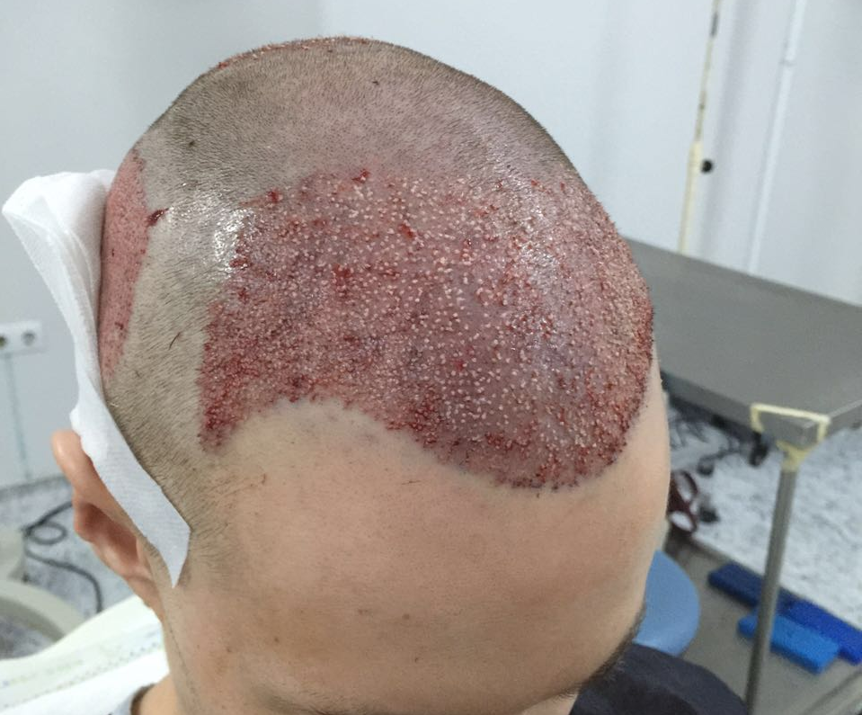 Das Bild habe ich bei normalen Tageslicht aufgenommen. Die verpflanzten Grafts produzieren ja für ein paar Tage noch Haare bevor sie dann ausfallen und "richtig" nachwachsen. Auf dem Bild sieht man allerdings sehr viele Haare nicht richtig, da einige dabei sind die nur ca 1 mm lang sind. Soll aber alles vollkommen normal sein und die ersten verpflanzten Haare fallen auch schon wieder aus.