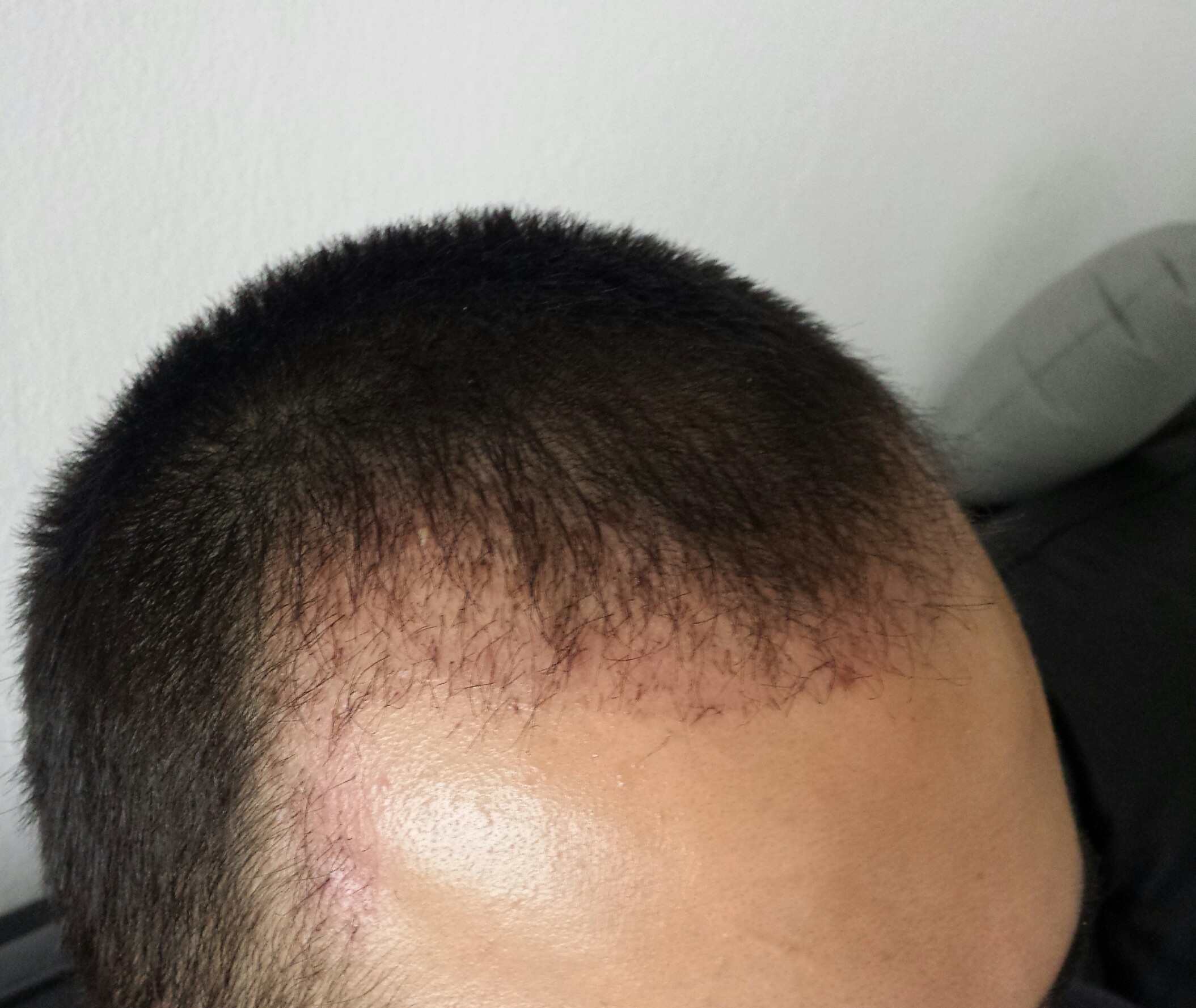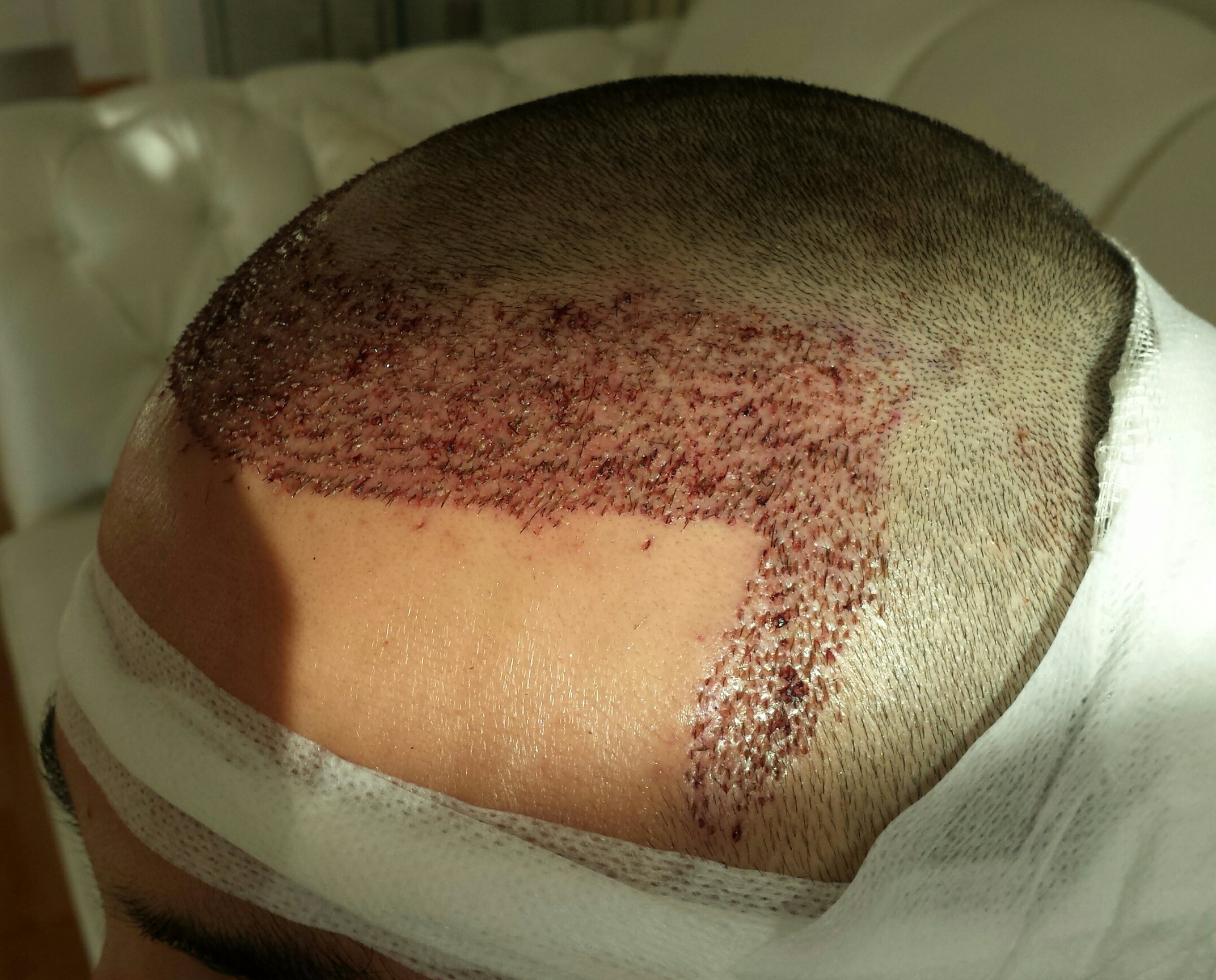Wenn du deine Haare in Zukunft auf 3 mm rasierst, wird man sonst kleine weiße Punkte sehen. Daher mein Rat, lass lieber ein paar Tage die Krusten länger drauf, als damit zu spielen und abzupiddeln. Gerade am Donor, wo keine Haare eingesetzt sind, neigt man schnell zu kratzen.