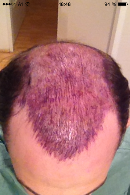 Am 15.1. gings dann um 7h mit dem Taxi in die Praxis, kurzes Gespräch, Haarlinie gezeichnet, zwei Tablettchen, Fotos und dann lag ich schon zu klassischer Musik am OP Tisch und der Spenderbereich wurde bearbeitet. Zuerst einige Spritzen in den Hinterkopf, ja das ist etwas unangenehm, wobei das eher psychologisch war, ich hasse Nadeln und die bildliche Vorstellung einer Nadel in meinem Kopf...naja Shocked dafür hab ich dann nichts mehr gespürt und der Streifen wurde entnommen. das ganze dauerte etwa zwei stunden. im Anschluss kam Laura Muresanu und nahm die schnitte für die Grafts im Empfängerbereich vor während etwa 9 Leute unter Mikroskopen die Grafts bearbeiteten... das dauerte etwa 1 1/2 Stunden. Kurz die Beine ausgestreckt und dann wurden mir schon die Grafts von links, rechts und hinten gleichzeitig eingesetzt. Laughing das dauert dann halt. inkl. einer halbstündigen Mittagspause mit lecker Essen saß ich dann noch etwa 6 Stunden auf dem Stuhl...