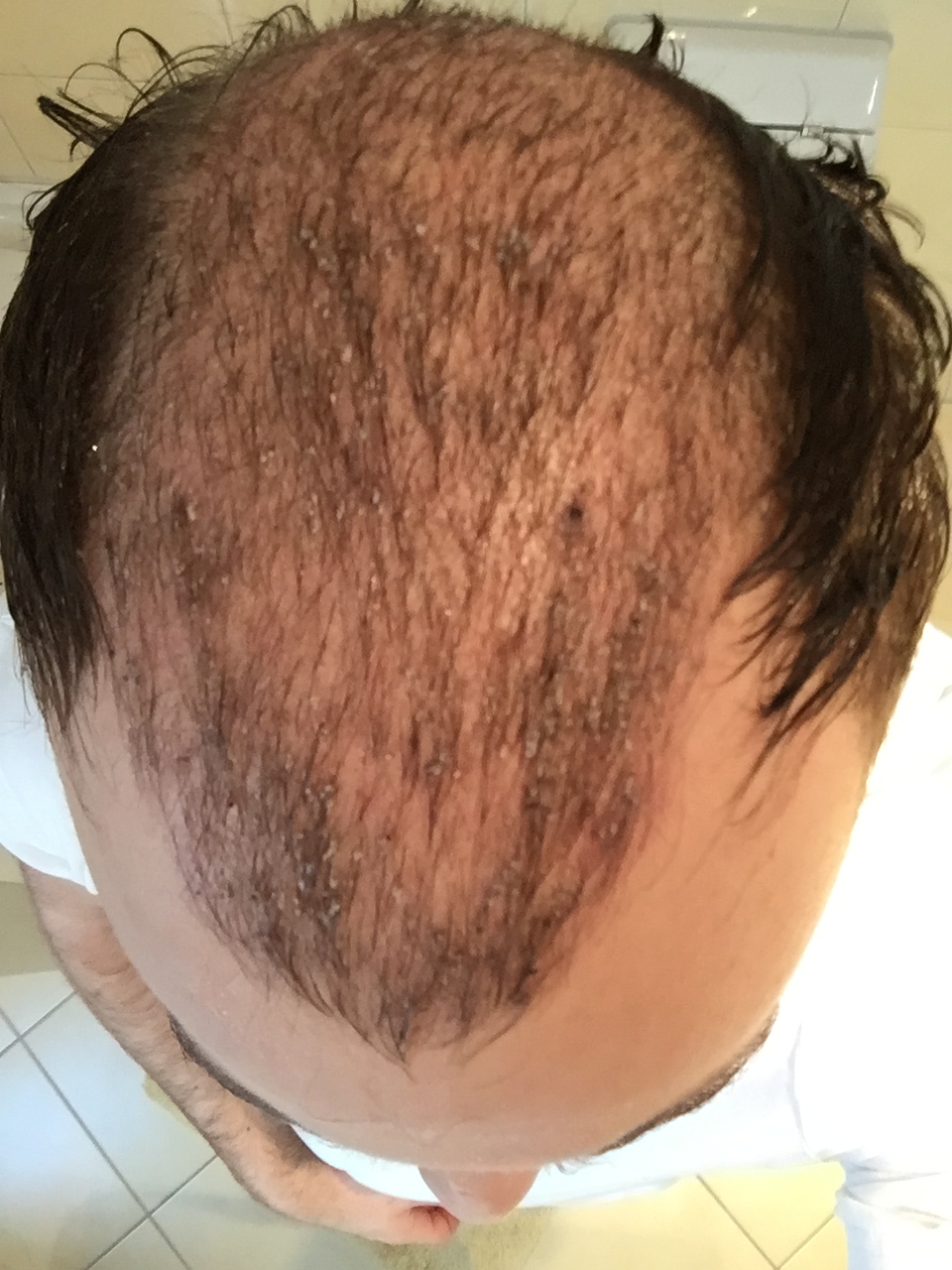 Die Klammern sind noch drin und verursachen weiterhin leichte Schmerzen insbesondere wenn man auf dem Rücken liegt. Empfängerzone juckt vereinzelt etwas und es sind Krusten erkennbar. Bisher sind noch keien merkbaren Haare ausgefallen, denke aber das setzt in den nächsten Tagen ein.