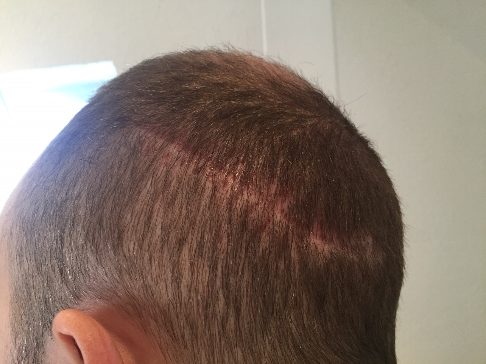 Also gehen wir auch davon aus, dass die Narbe nicht nur recht schmal und nicht wulstig ist sondern auch teils Haare durchwachsen, was durch den speziellen Narbenverschluß seitens HattingenHair möglich ist.