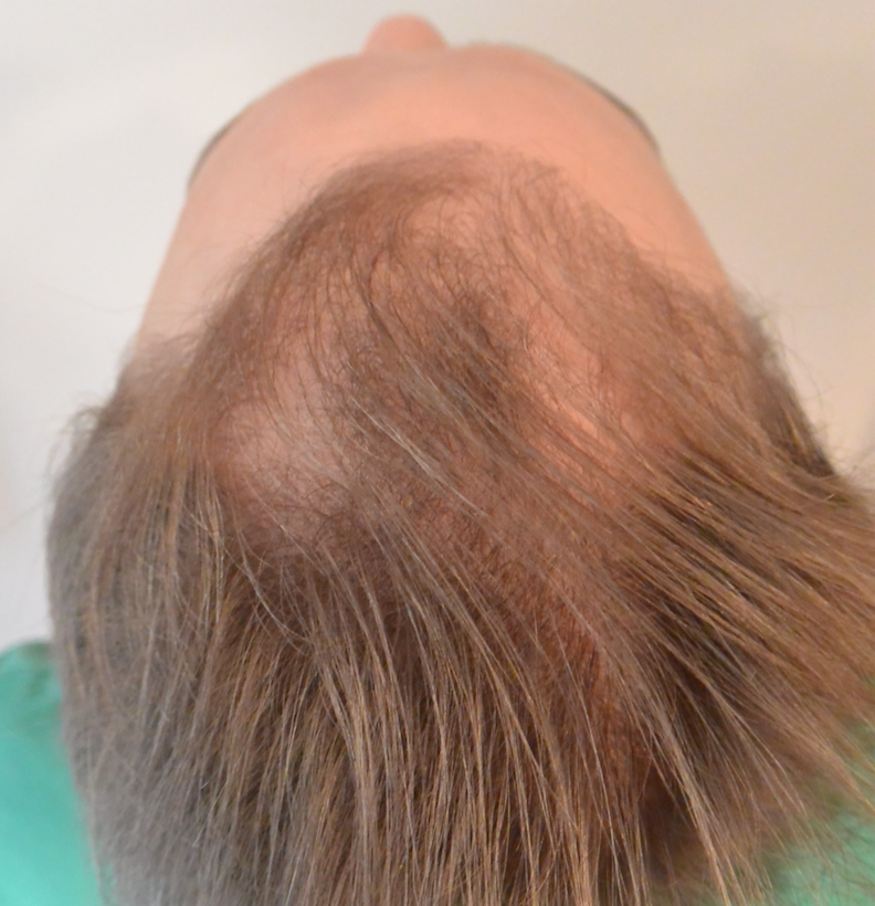 Zu dem Bild (Foto von oben) aus der 1. HT muss man anmerken, dass 1.400 Grafts auf die behandelte Fläche schlicht und einfach viel zu wenig waren, vor allem weil man mit FUT gleich einen größeren Wurf machen hätte können.