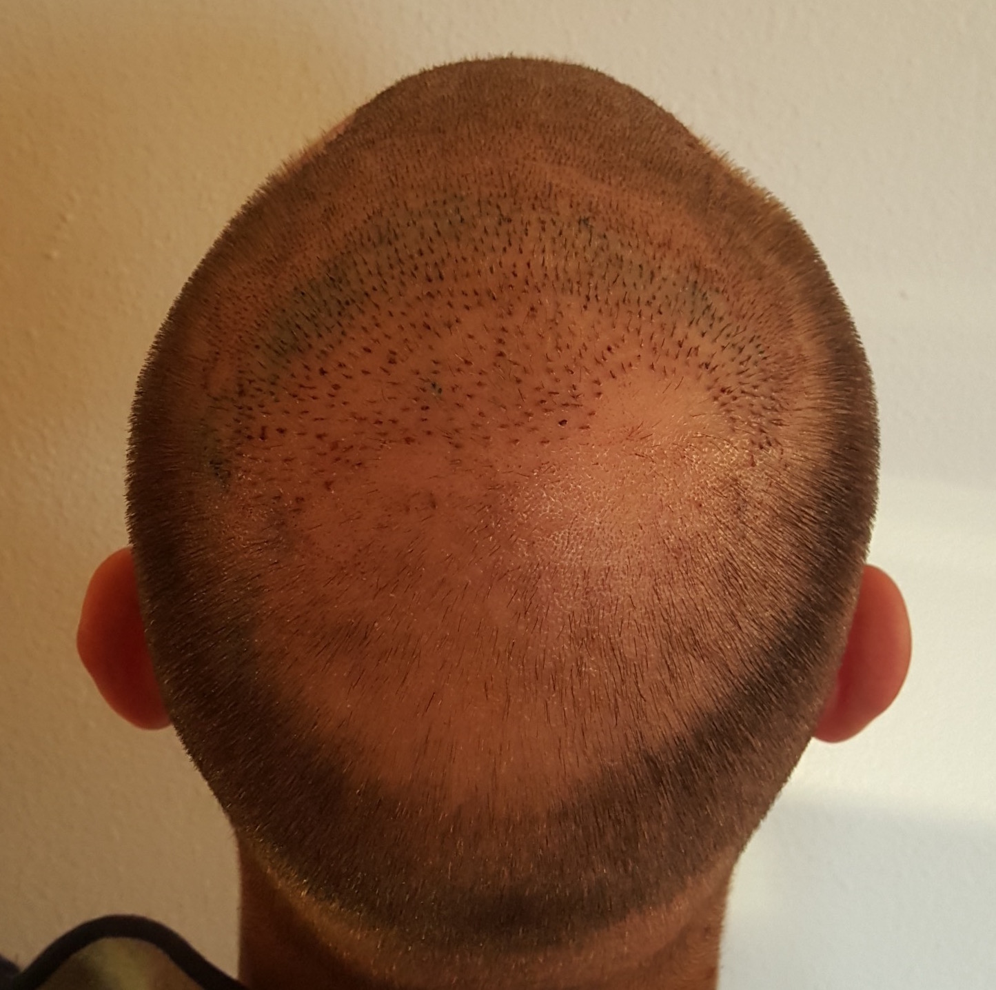 Am zweiten tag wurden bei mir 860 Grafts entnommen und wiedereingesetzt. Diese wurden verwendet um die Tonsur mit einer Low Density zu bestücken. Hier wird natürlich darauf geachtet, wie sich die „alte" Haare verhalten haben. Wirbel usw. werden beachtet und genauestens auf ein natürliches Ergebnis geachtet.