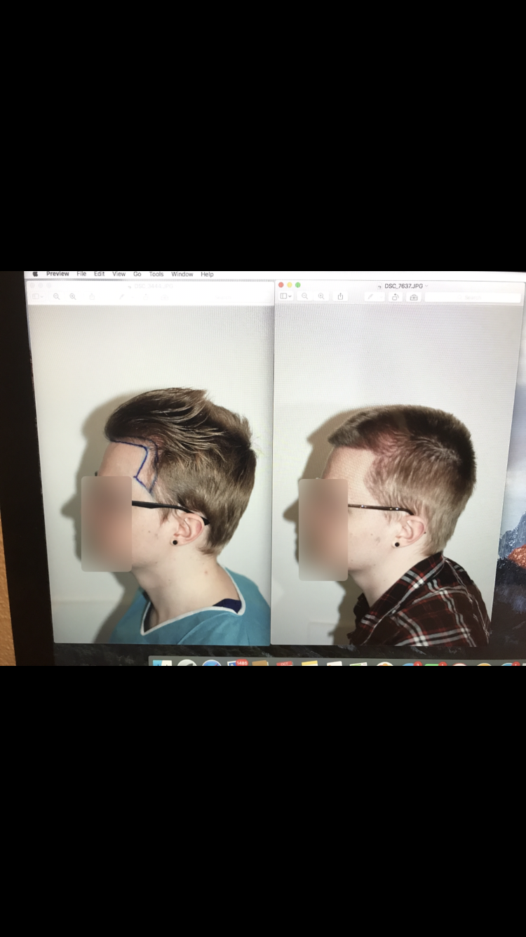 Nun anbei die entsprechenden Fotos. Dr. Feriduni hat die transplantierte Zone weiter verdichtet, die Temple Points etwas weiter nach vorne verlegt und zudem auf der rechten Seite einige gekringelte Grafts extrahiert.