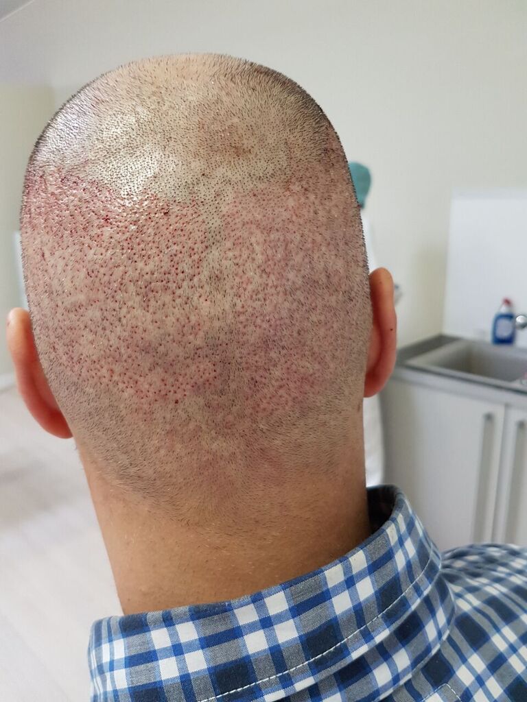 Die Entnahme wurde mit Mikromotor durchgeführt und es sollen 3000 Grafts entnommen und eingesetzt worden sein. Hier könnt Ihr 1 Foto von der damaligen Behandlung sehen. ( Weißer Verband um den Kopf)