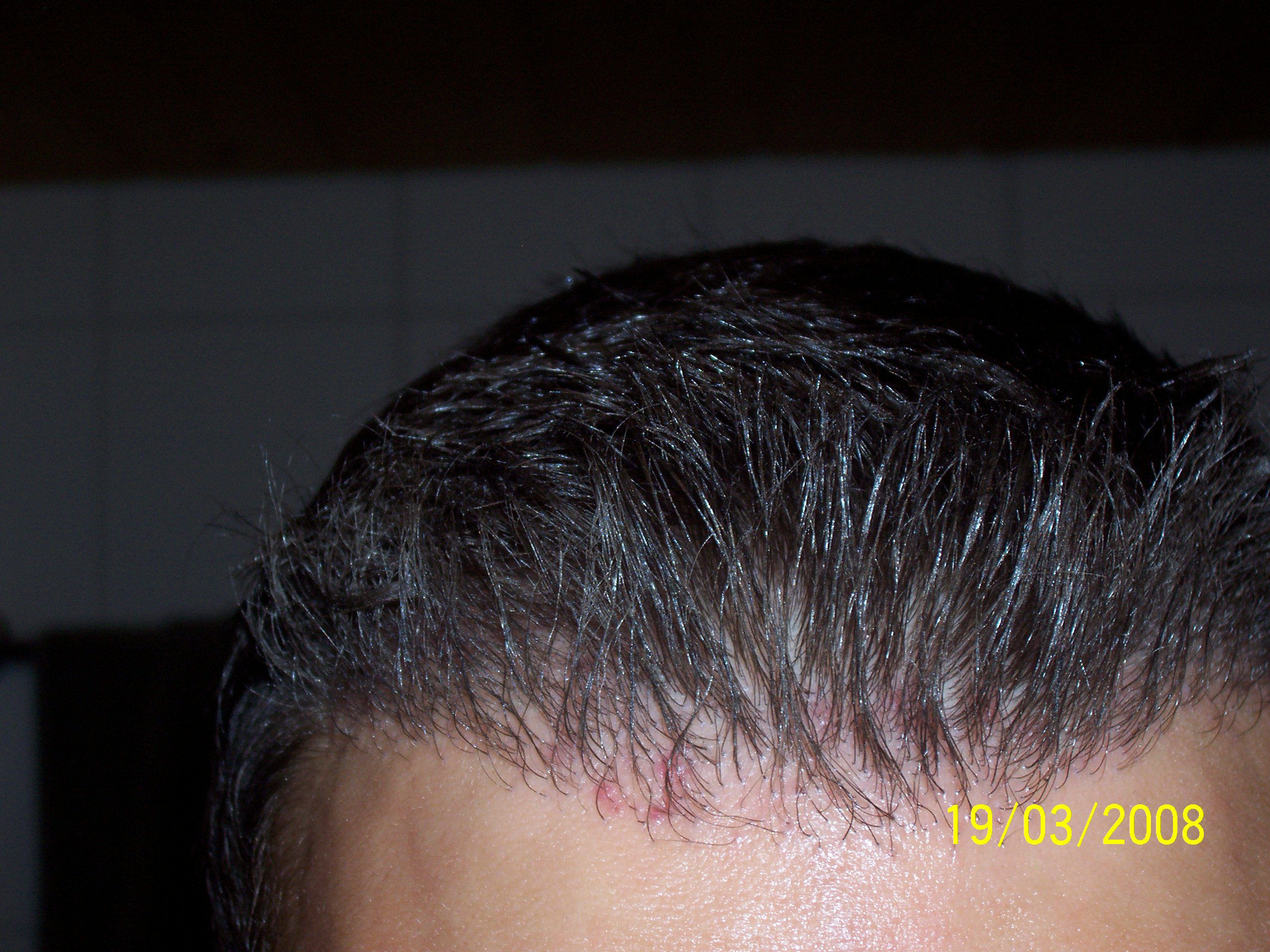 Außerdem sieht man ja auf den Fotos gerade Haare, die durch die Kopfhaut brechen (Pickelbildung). Das ist ja ganz klar noch Neuwuchs im Anfangsstadium.