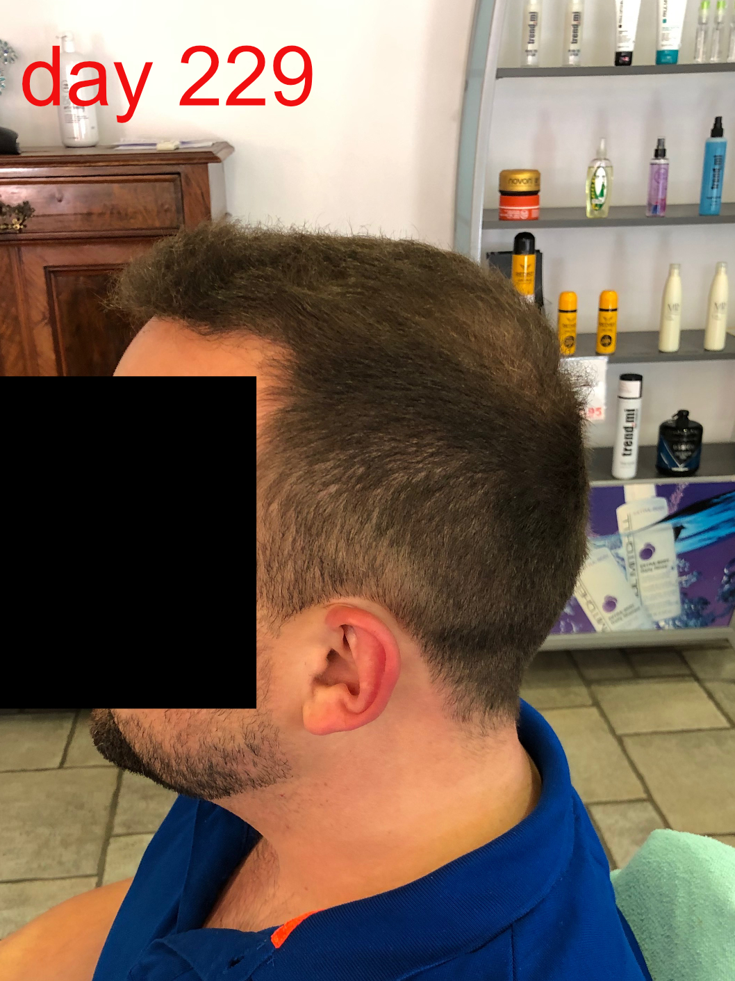 Tag 229 - 7,5 Monate nach der OP. Das Haar ist noch einmal ordentlich dicker geworden und ich bin sehr glücklich mit dem aktuellen Status. Hinten ist sicher noch Potential und ich hoffe auf weitere Verbesserung in den nächsten Monaten. Aber auch so bin ich jetzt schon extrem glücklich den Schritt gemacht zu haben...