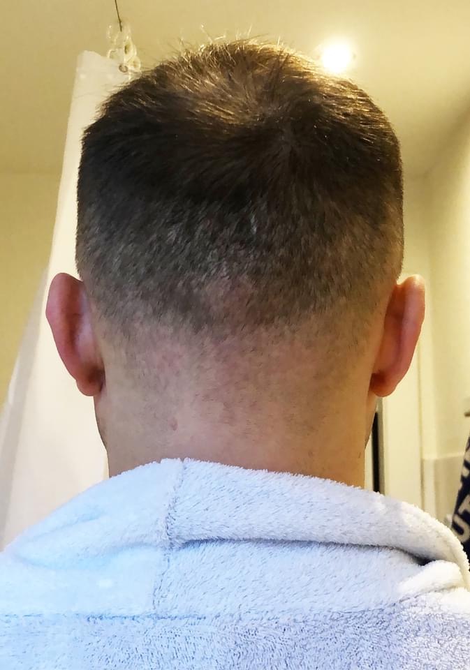 Der Spenderbereich ist geheilt und nach meinem ersten Haarschnitt von ca. 1 mm ist nicht einmal sichtbar, dass der Bereich operiert wurde. Also nach 4 Monaten ist der Spenderbereich sozusagen fertig.