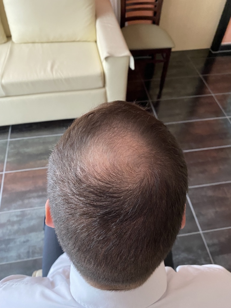 Jetzt sind 2 Monate vergangen und es fängt an zu wachsen auch wenn ich vorne noch Löcher habe. Ich habe gelesen, das es aber nach 3 Monaten erst richtig wachsen wird. Vorne sieht es schon besser aus als auf dem Haarkranz