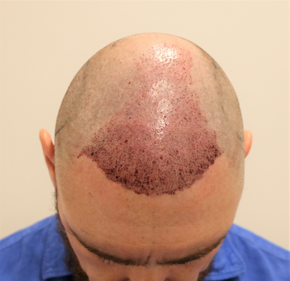 2500 Grafts wurden an einem einzigen Tag mit der manuellen FUE-Methode transplantiert. Dies wurde mit einem Vollrasierkopf durchgeführt.