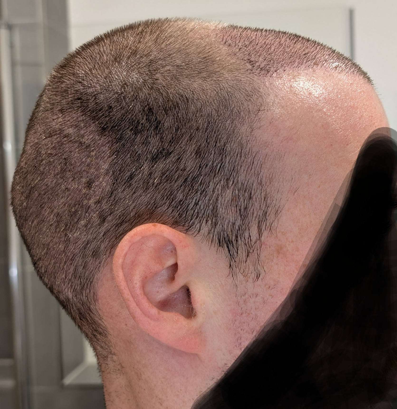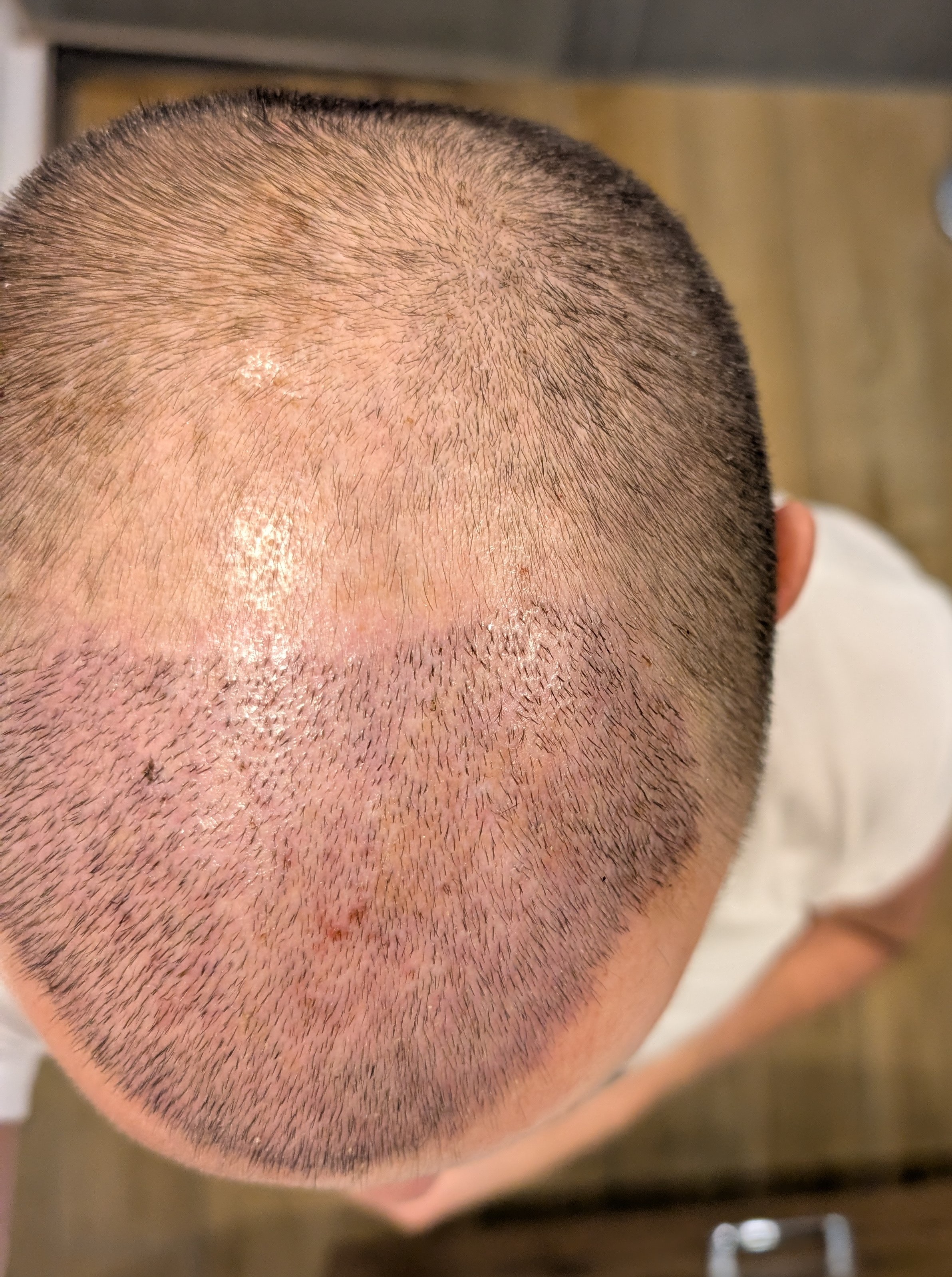 Wurdest du aufgeklärt, dass du mindestens 2 HTs für eine vollständige Abdeckung benötigst? Viele Ärzte machen nur 3.-4.000 Grafts pro OP. Der Übergang ist schon relativ scharf. Besser wäre eine Bumerangform gewesen, die ein bißchen sanfter ausläuft.