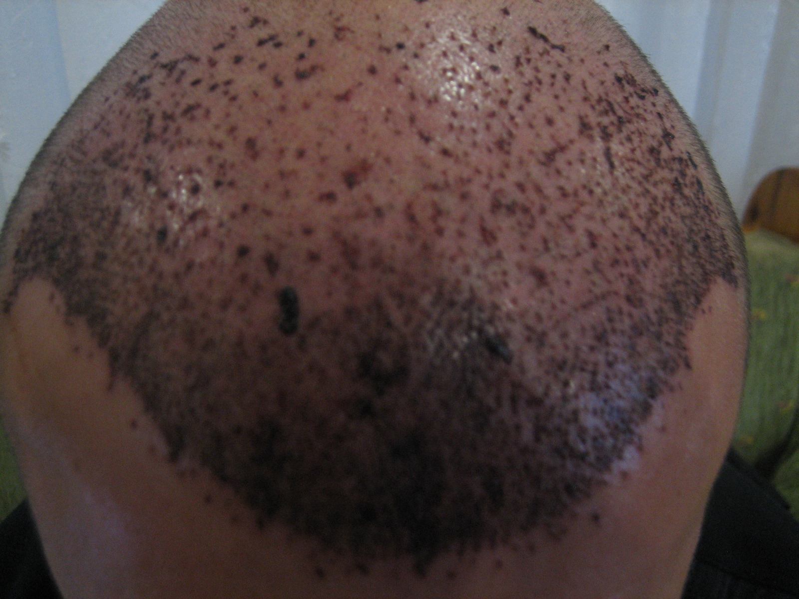 Du hast für Dein riesiges Problem aus meiner Sicht die falsche Technik gewählt, für meinen ganz persönlichen Geschmack sehe ich zu viel Blutfluss (zu große Werkzeuge?) und die Graftverteilung empfinde ich als nicht überzeugend. Gefällt mir ehrlich gesagt gar nicht. Einzelne Einstiche auf 10cm2 Fläche sollen aus Deiner Sicht was bringen?