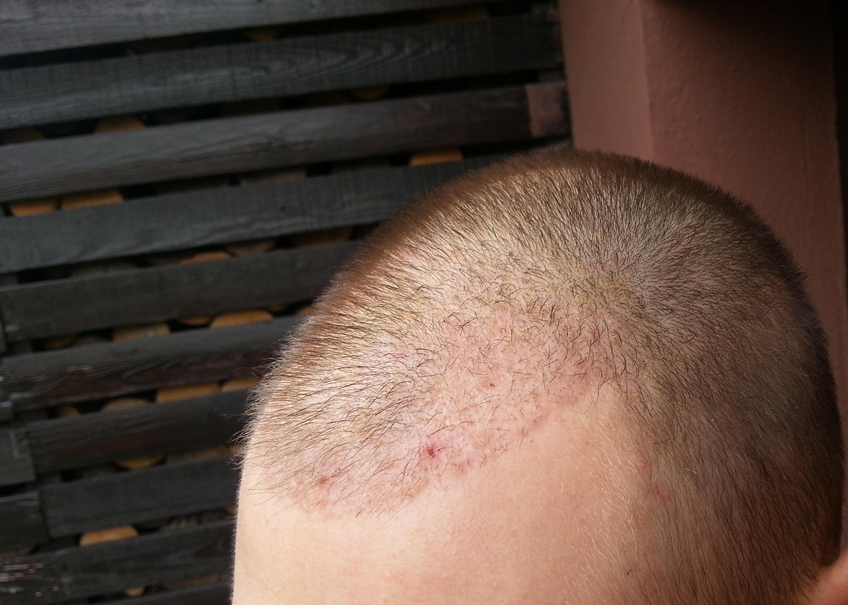 Genau vor 2 Monaten wurde meine OP durchgeführt, daher heute ein kleines Update. Wie man sieht sind die Rötungen nach wie vor deutlich vorhanden. Wenn man von vorne draufschaut geht es halbwegs, aber von oben siehts halt noch schlimm aus... Hab mir gestern mal vorsichtig die Haare gestutzt, das macht es ein wenig erträglicher... Ansonsten sprießen immer mal wieder kleine Eiterpickelchen (erkennt man gut auf dem Bild von oben), die ich vorsichtig ausdrücke oder aufsteche (daher die kleinen roten Krusten). Zu den Transplantaten lässt sich wohl noch nicht viel sagen, winzige Stoppel sind zu erkennen...