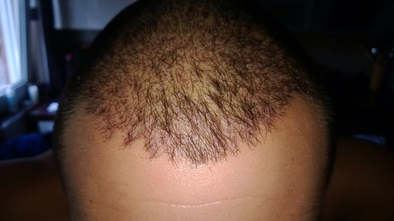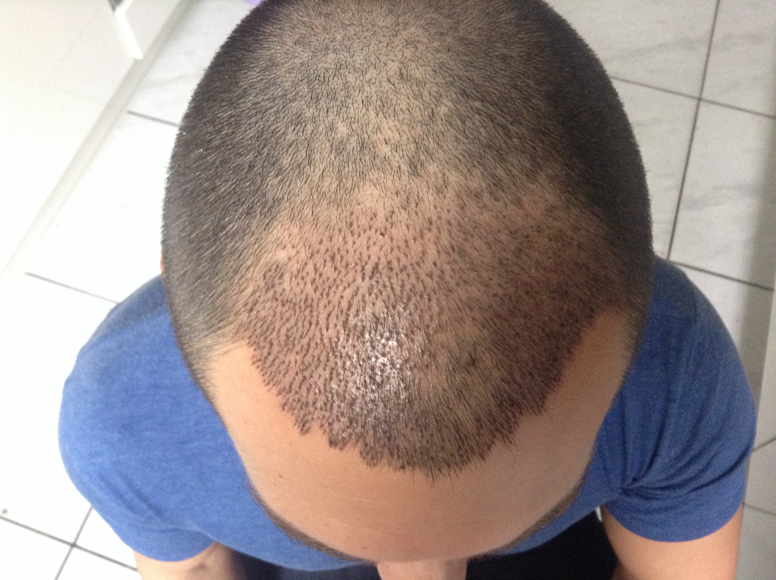 Hier ein Bild wo man es gut erkennen kann, die Haare in der Mitte bzw. Die längeren sind nicht transplantierte Haare.