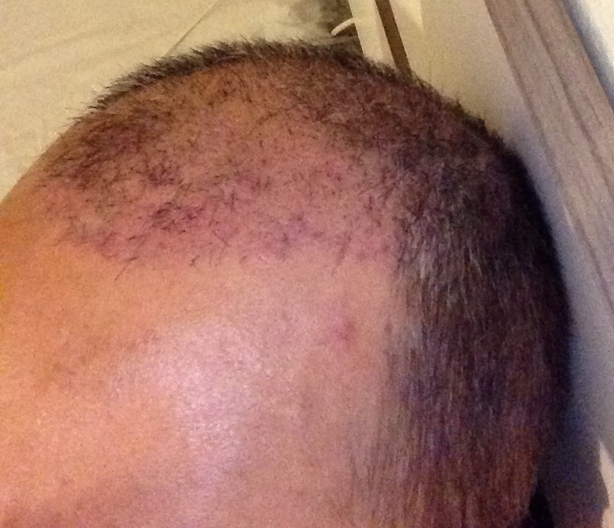 - Nachdem das Einsetzen der Grafts erledigt war, habe ich eine 10-minütige Laserbehandlung bekommen. Ich bekam ein Verband und bin dann ins Hotel gefahren. Darüber hinaus bekam ich u.a. auch Schmerzmittel und ein Nackenkissen, das ich zum Schlafen benutzen musste, damit die operierte Stelle nicht ungewollt in Berührung mit der Bettdecke oder anderen Gegenständen kommt. Man muss ja extrem vorsichtig mit den eingesetzten Grafts umgehen, damit sie nicht beschädigt werden.