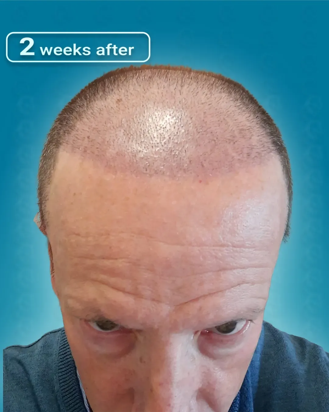 Bereits zwei Wochen nach der Haartransplantation bei der MedHair Clinic befand sich die Kopfhaut in einer stabilen Einheilungsphase. Die transplantierten Haarfollikel waren sicher verankert, leichte Rötungen entsprachen dem normalen postoperativen Verlauf nach einer DHI-Haartransplantation.