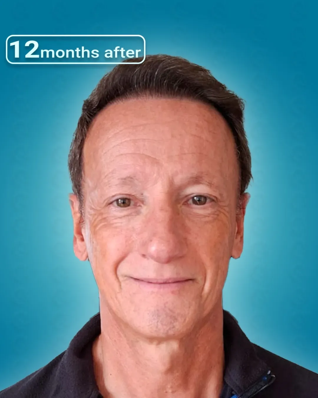 Das finale Ergebnis nach zwölf Monaten zeigt eine natürliche, gleichmäßige Haardichte mit einer harmonischen Haarlinie. Die transplantierten Haare sind vollständig angewachsen, fügen sich nahtlos in den bestehenden Haarbestand ein und sorgen für ein ästhetisches und langfristig stabiles Ergebnis nach der Behandlung bei der MedHair Clinic.