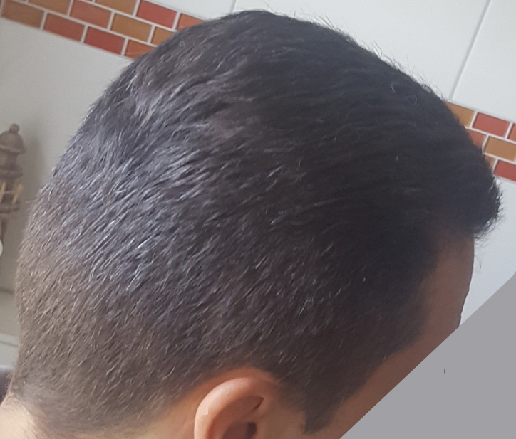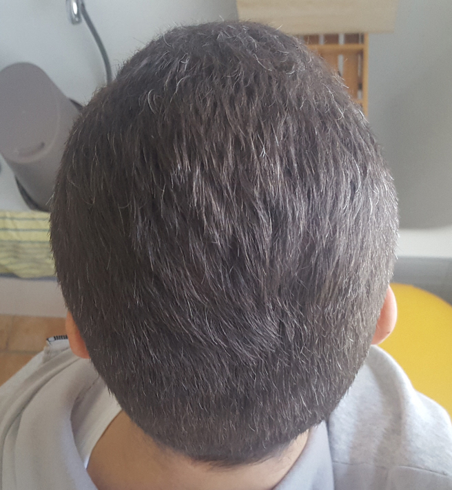 Die fortgeführte Minox-Anwendung hat den Haar-Status halten können. Die Front und der Tonsurbereich ist weiterhin gut dicht.