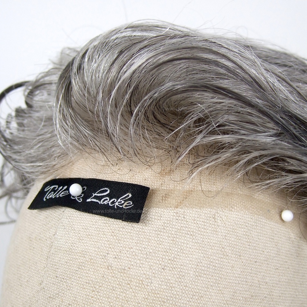 Sonderangefertigte Premium Stock Ware für einen Herren. Netz/Folien Kombination. Rund 80 % Grauanteil. (gering bis) Mittlere Haardichte mit (leicht) graduiertem, unregelmässigen Haaransatz.