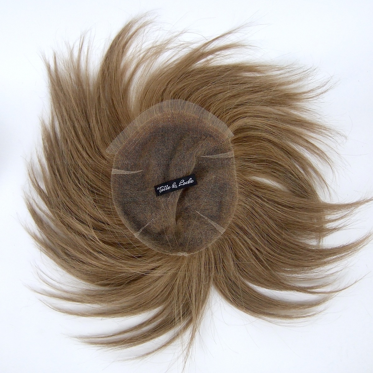 Individuell maßgefertigte Ware für einen Herren. Swiss Lace. Verschiedene Blondtöne. Unterschiedliche Grauanteile. Geringe Haardichte mit graduiertem, unregelmässigen Haaransatz.