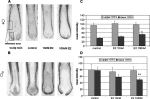 Figure 4.Transforming growth factor-2 (TGF-2)-like immunoreactivity expression pattern shows significant differences after 17--estradiol (E2) treatment in the lower outer root sheath (ORS) in male and female hair follicles. (A, B) TGF-2-like immunoreactivity increases significantly in the lower ORS of (A) female scalp hair follicles and declines in the lower ORS of (B) male hair follicles after E2 treatment in vitro. Culture period 48 h (TSA staining, label rhodamine, nuclear counterstaining 4',6-diamino-2-phenylindole (DAPI), gray scale and inverted, original magnification 250). (C, D) Quantitative analysis of sex-dependent differences in TGF-2-like immunoreactivity using Scion image (mean intensity), (C) female, (D) male, E2-treated mean intensity was compared with the non-treated control, n=36 hair follicles per group, SEM, p-value: 0.01<*<0.05, 0.001<**<0.01.