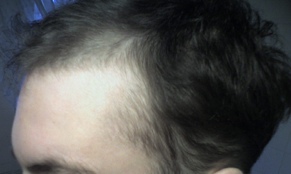 hier mal ein foto, wie der frische neuwuchs bei mir aussah. die kurzen haare entlang der seitlichen haarlinie und in dem "dreieck" sind kurz darauf alle terminalhaare geworden, vorher wars dort kahl.