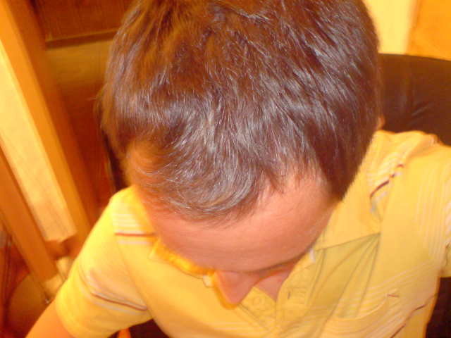 Nr 4 die Front plus Ecken und Haaransatz hier sieht es düster aus....dort wo noch nen paar Resthaare rauslucken standen noch vor der Minox und Flutaanwendung Haare.Die wären eh bald gekommen.Wie gesagt noch kann ich die Front einigermaßen kaschieren. Laughing