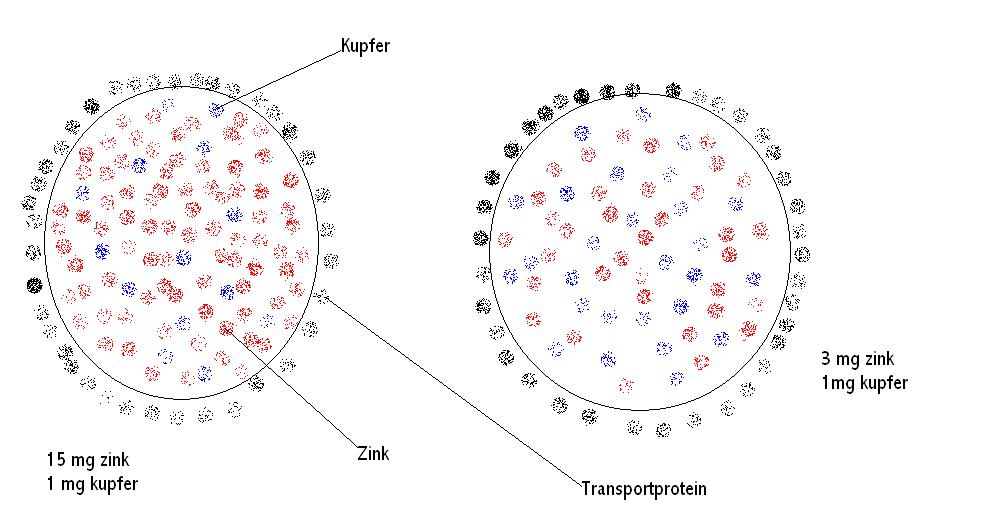 wenn du 15 mg Zink und 1 mg kupfer zusammen nimmst.....dann verdrängt das eine das andere.....in der aufnahmefähigkeit....zudem die aufnahmefähigkeit von transportproteine abhängt und diese nicht unbegrenzt zur verfügung stehen.... Exclamation