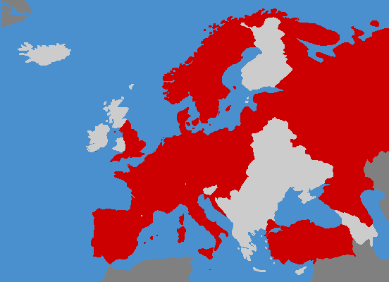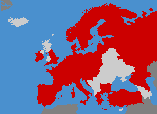 Österreich, Belgien, Kroatien, Dänemark, Deutschland, Lettland, Luxemburg, Portugal, San Marino, Schweden, England, Frankreich, Monaco, Norwegen, Slowakei, Schweiz, Vatikan, Tschechien, Estland, Ungarn, Italien, Litauen, Malta, Niederlande, Polen, Russland, Spanien, Türkei