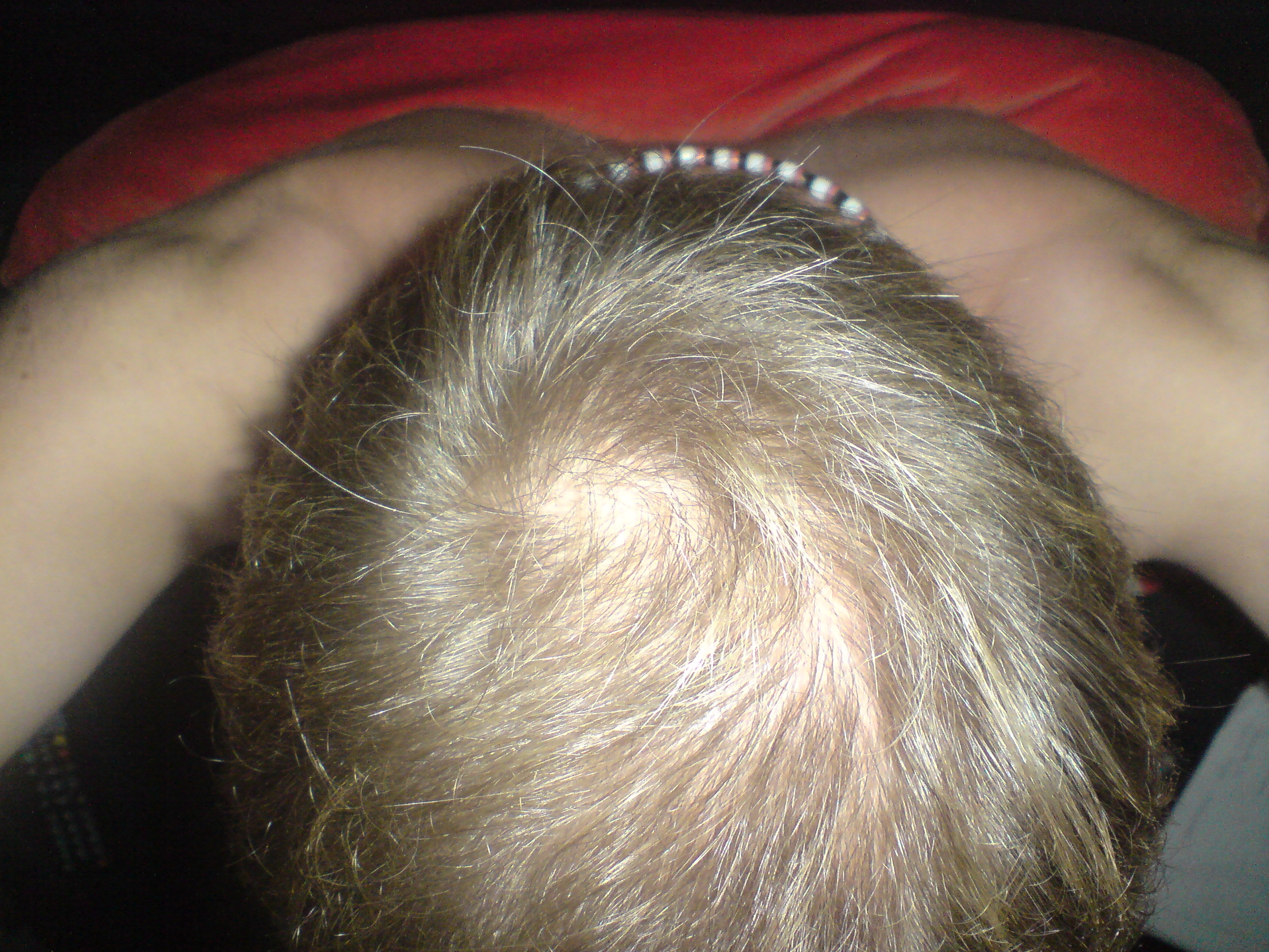mal wieder en monar rum, update zeit...fin nehm ich nun 5 monate, weiter verschlechterung tonsur, linke ghe ebenfalls...jedoch seh ich da überall kleinere haare, also ma sehn. beurteilt selbst, haarlänge ca. 2cm-2,5cm. hab dienstag en termin beim hautarzt, was sollte er machen? achja, bild wurde ohne blitz im hellen raum gemacht.