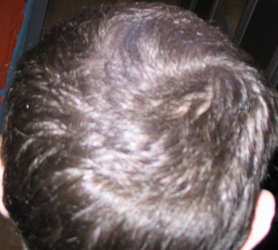 Weil selbst so wies im Moment ist, fallen die Haaren an den Seiten und hinten nach unten, so das sich da auch schon so nen Kranz abzeichenet (siehe auch mein Bild hinten)