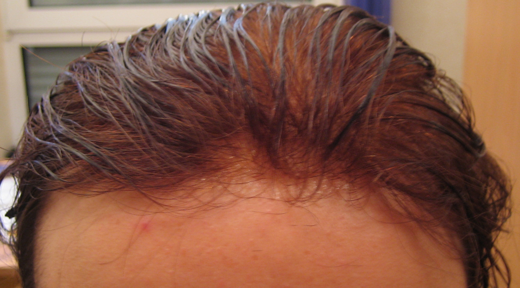 Unmittelbar nach dem Verkleben heut Nachmittag hab ich die Haare mal mit etwas Wasser zurückgekämmt und ein paar Fotos geschossen. Normalerweise trage ich Pony-Frisur, aber ich wollte mal den "Ansatz" begutachten. Das, was da glänzt, vorne, das ist ein 3-MIL-Contour-Tape... eigentlich "Flüssikleber" in Form eines Klebestreifens. Dieser Glanz verschwindet nach ein paar Stunden (oder spätestens nach dem ersten Duschen KOMPLETT).