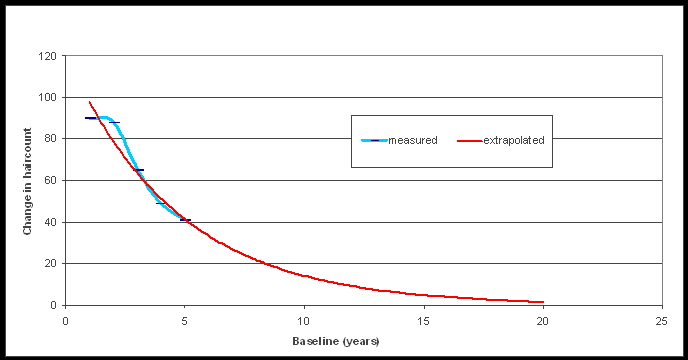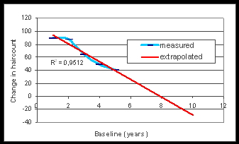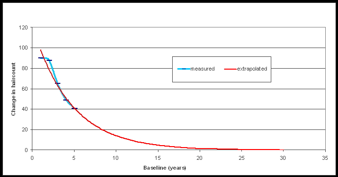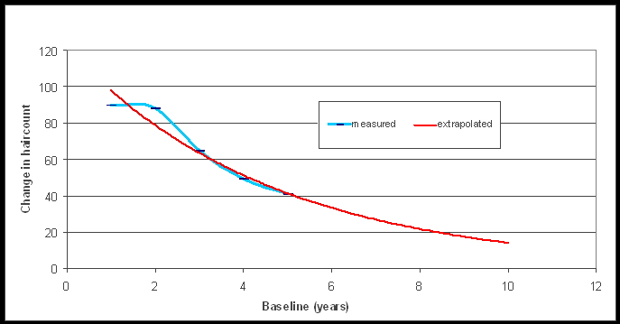 Es wird wohl jeder zustimmen, dass es unwahrscheinlich ist, dass die Haaranzahl nach 5 Jahren direkt auf Null runterfällt.
