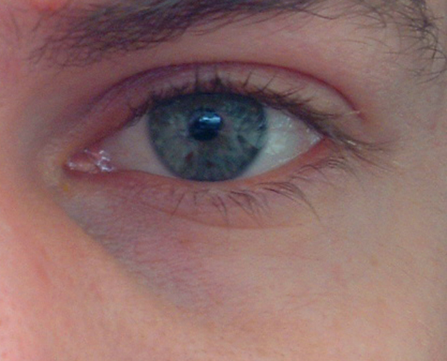 Foto bei Tageslicht ohne Blitz, direkt von der Kamera runter und den Bereich mal ausgeschnitten. Man beachte die "schöne" Furche, die schön dunkel das Licht schluckt, aufs feinste durchzogen von feinen lila Äderchen, die letzte Woche noch nicht da waren, edel auslaufend in rötlich schimmerndem Weinrot, bis zur Mitte des Auges auslaufend und frontal gesehen optisch in einer Linie weitestgehend unten mit der Nasenspitze abschliessend Dead Dead Dead