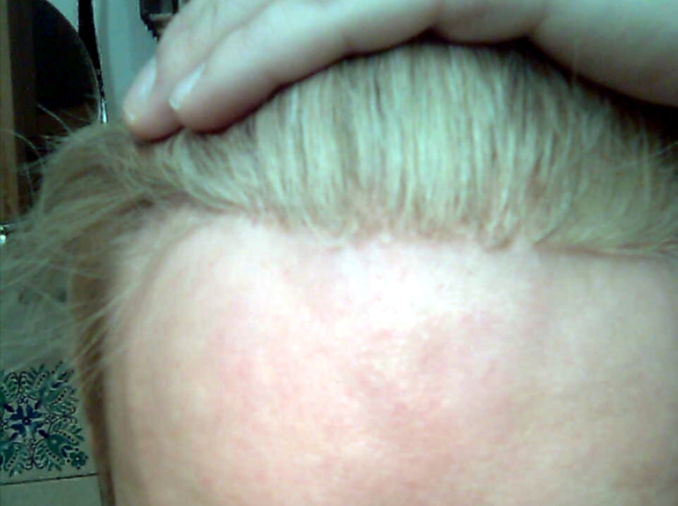 5) Optik: Hatte ich schon ganz oben angesprochen. Aber nicht nur das Fallen der Haare finde ich bei SFS natürlicher, sondern das alle 7 Tage neu verklebte Lace hat gegenüber einer 4 Wochen am Stück getragenen "Kunsthaut" einen entscheidenden Vorteil: Wenn man, wie ich, noch Eigenhaar auf dem Oberkopf hat, das fleißig unter dem CS nachwächst, dann kann man nicht leugnen: Nach spätestens 2 Wochen "sieht man etwas". Etwas! Nicht, dass man erkennen würde, was da unter der Kunsthaut geschieht, aber die Fläche sieht einfach nicht mehr optimal aus. Die Mischung aus Kleber, Talg und Haaren (bei mir dunkelbraun!!) wirkt alles andere als klar (wie es sein müsste), sondern "dunkler"... trüb irgendwie ... Wo das CS ist, wirkt die Kopfhaut also von Woche zu Woche dunkler, in der 4. Woche fühlte ich mich dadurch schon recht unsicher. Man muss natürlich dazu sagen, dass ich (für den Anfang, zum Übergang) eine sehr geringe Haardichte gewählt hatte, wodurch ich besonders viel "Haut" zeigte. Da fällt eine Verfärbung derselben natürlich mehr auf, als wenn man ein CS mit 100% Dichte trägt... Aber bei solchen Dichten zieht andererseits das Argument sichtbarer Knüpfknoten bei SFS auch nicht mehr, weil man eh kaum noch auf die Kopfhaut sehen kann. (Davon ab, können Knoten - wie bereits erwähnt - RICHTIG gut gebleicht werden, dann sieht man sie sowieso nicht)...