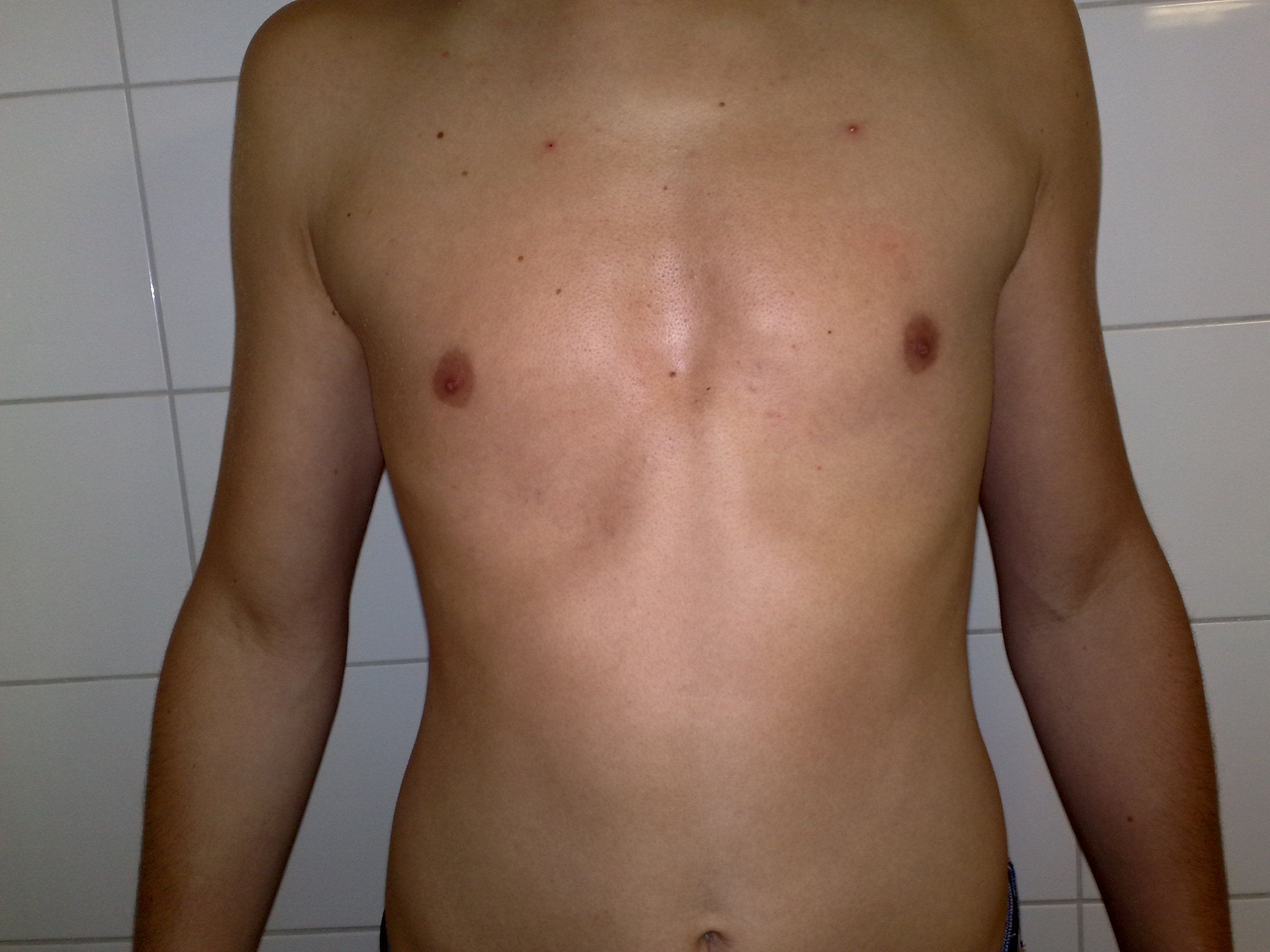 Jau hier einmal zwei Bilder meiner Brust, einmal mit Blitz und einmal ohne. Von oben gsehen und bei gewissen Lichtverhältnissen sieht es schlimmer aus als auf den Fotos.