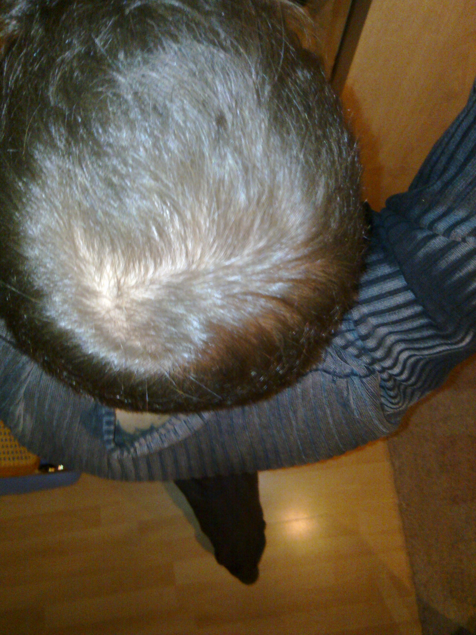 Wie gesagt, da ich väterlicherseits auf der sicheren Seite bin, habe ich mich auch nie als Haarausfallsopfer gesehen. Ich habe einen sehr ungünstigen Wirbel am Hinterkopf, wegen welchem ichschon als 19-, 20-jähriger öfters mal gefragt wurde, ob ich hinten Glatze bekomme. Natürlich habe ich das verneint und auf meinen Vater und meine Familie hingewiesen. Trotzdem stand man dann einige Tage vorm Spiegel und hat aus verschiedensten Perspektiven geschaut, ob da doch was sein könnte. Selbst meine Mutter, meine Schwester oder Freunde meinten beim Nachschauen des Hinterkopfes, dass das nur der Wirbel sei.