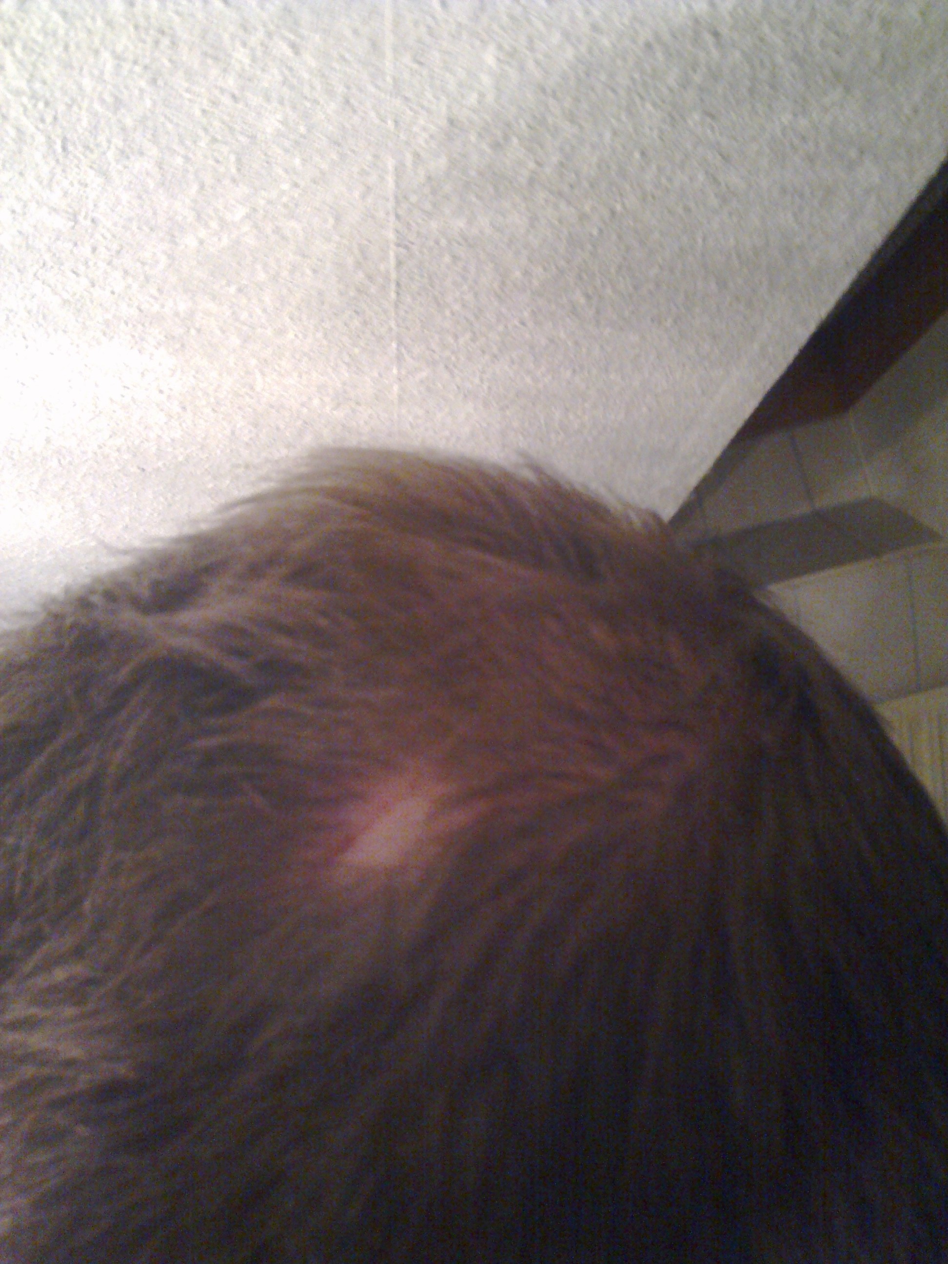 Neben der Wunde, also dort, wo weder eine Verletzung war oder sich Wundkruste befindet, habe ich seitdem eine kahle Stelle, ca. 1 Cent-Stück groß. Ich gehe davon aus, dass mir bei dem Schlag die Haare an der Stelle irgendwie herausgerissen wurden, da die Stelle mit der eigentlichen Verletzung nichts zu tun hat. Jedoch sieht das relativ beschissen aus. Wie oben schon gesagt, die Wunde war klein und die Narbe würde man nicht sehen, wenn da nicht die kahle Stelle wäre. Denn die ist nun erheblich größer als die eigentliche Wunde.