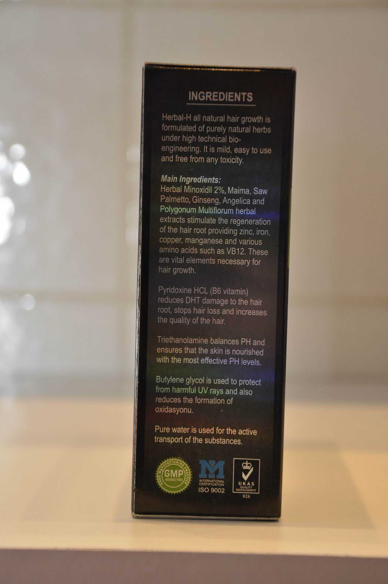 Selbstbewusst präsentieren sich die von der Internetseite bekannten Versprechen in englischer Sprache - Keine Nebenwirkungen, 100% natürlich, Stoppt den Haarvelust in 7 Tagen, lässt neues Haar in 15 Tagen wachsen. Große Worte, die mich etwas skeptisch stimmen.