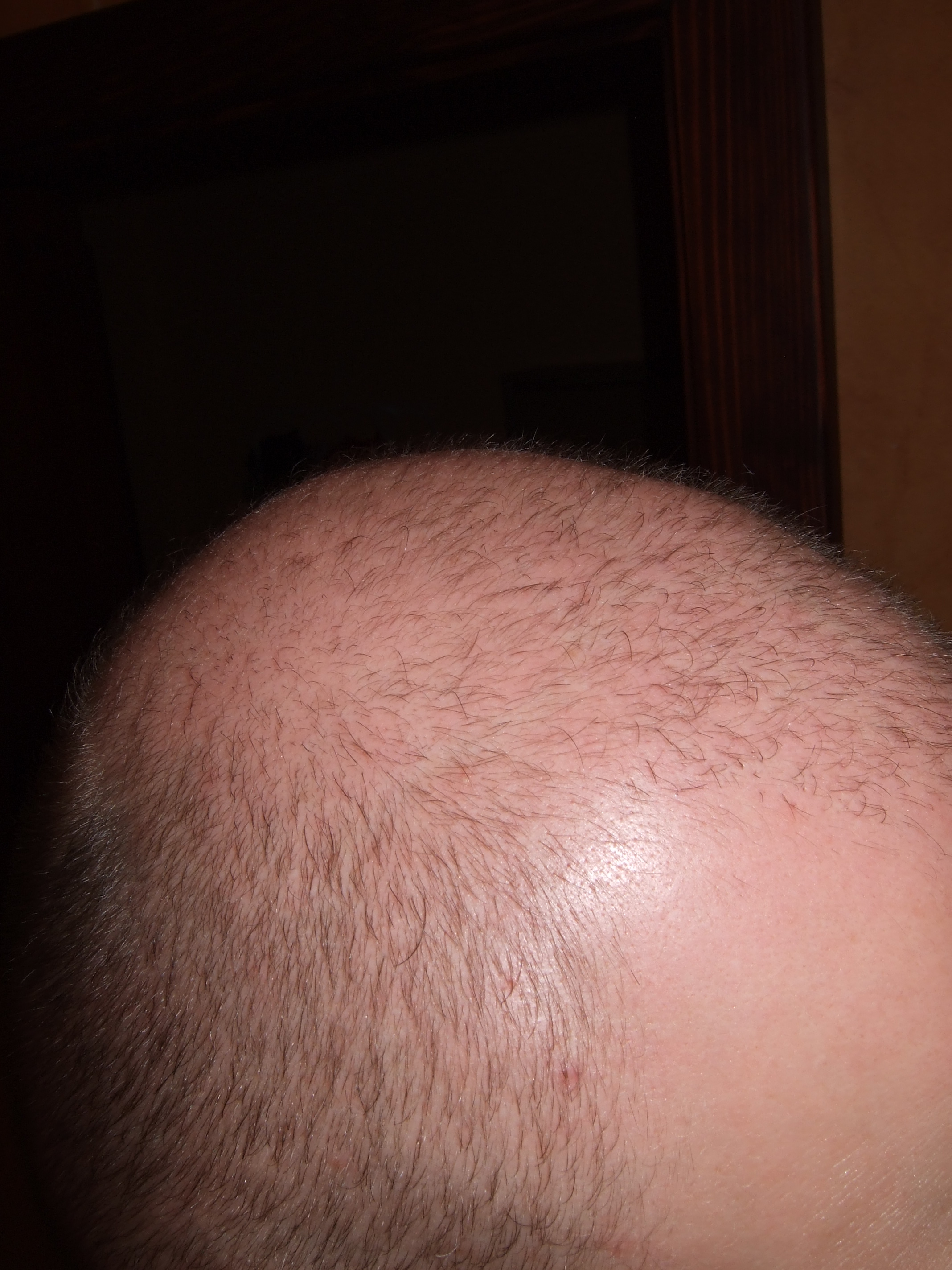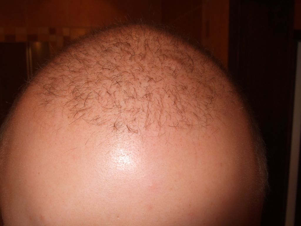 So hier ein Foto von vorne. Da sieht man nicht eine grossen Unterschied da die Felluss Haare um einiges Duenner und nicht pigmentiert sind als das Terminalhaar. Denke jedoch das nach 3 Monaten volle Haare haben werde. Was ich festgestellt habe ist das die Haare viel viel schneller Wachsen. Nach der Bestrahlung vor 6 Jahren wuchsen die Haare extrem langsam. Nun wachsen Sie super schnell. Am 10.11.2010 habe ich ein 0.2mm Schnitt mit dem Rasierer gemacht und habe jetzt sicher 1.5 - 2.5 cm.