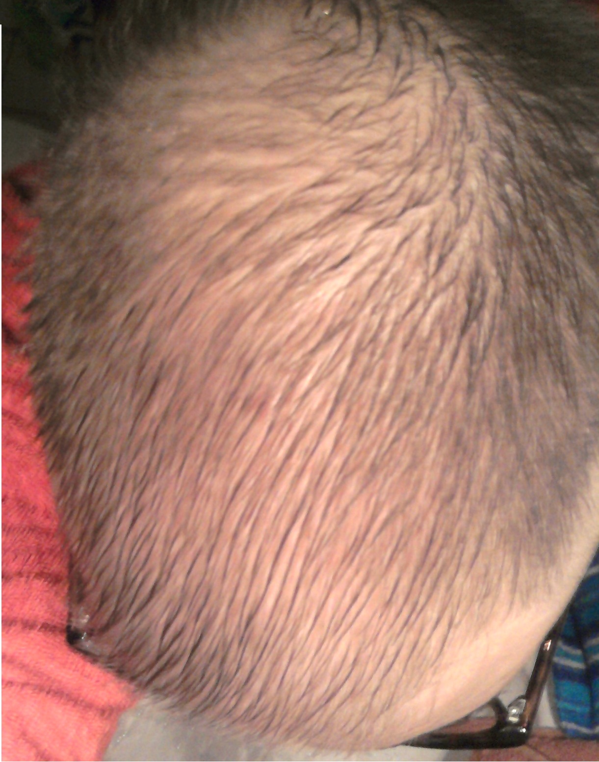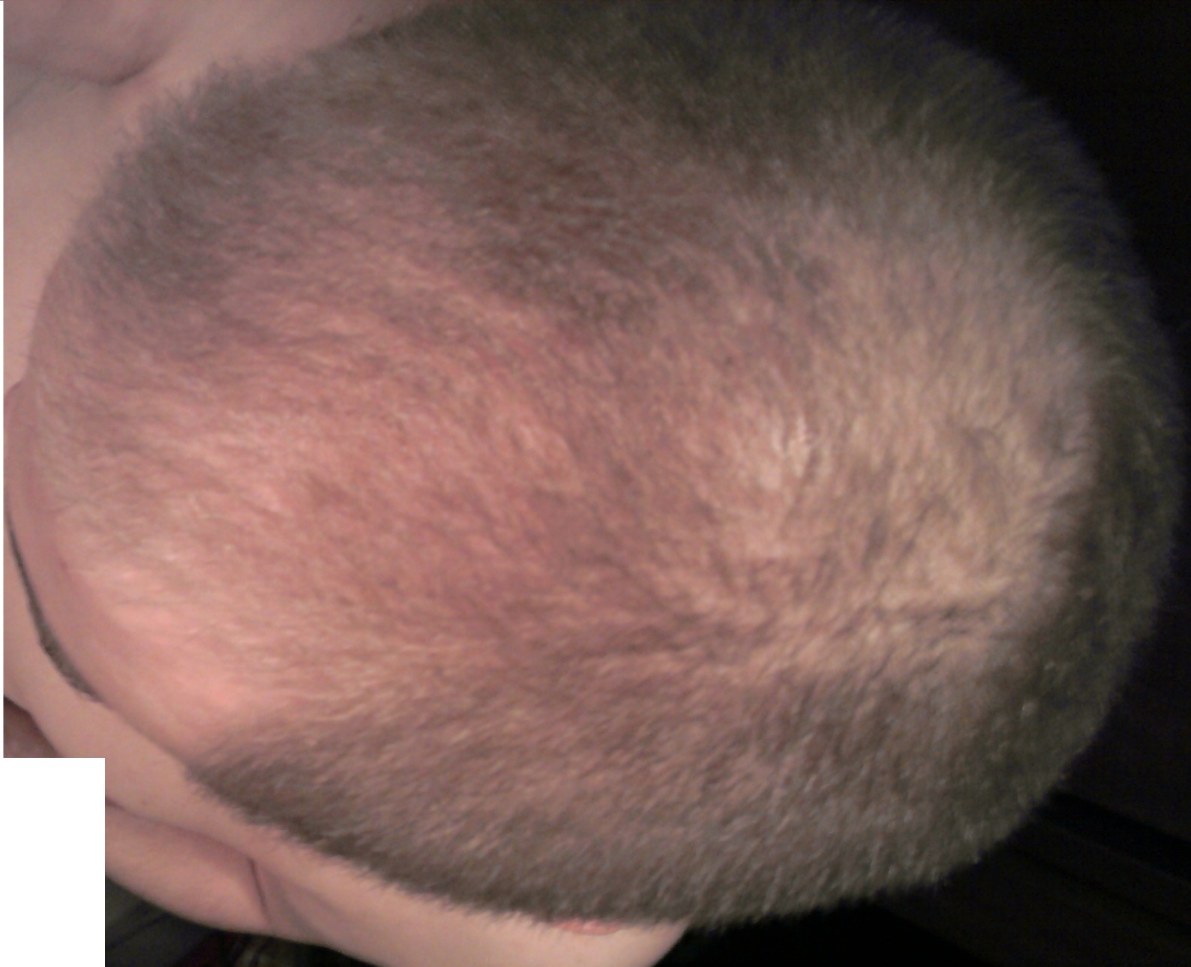 Das erste Bild ist unmittelbar nach der Rasur.. die Kopfhaut sieht dort flächenweise sehr gerötet aus..