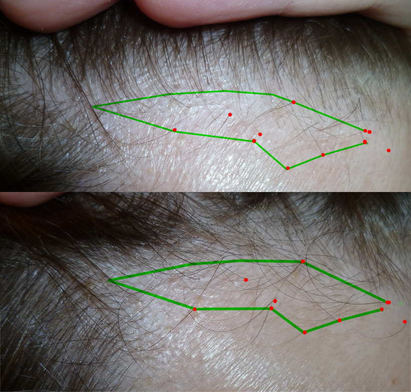 Nochmal detailshots von der Haarlinie, rechte GH. Oben vor 5 Monaten, unten heute. Mit ein bissel Aufwand kann man gleiche Haare markieren.