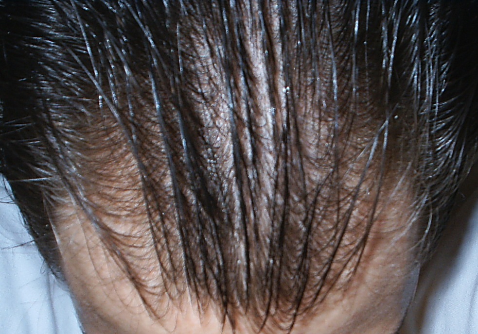 Im vorderen Kopfbereich ist es schon stark ausgedünnt. Im Mittelbereich ist es auch schon etwas dünner geworden und hinten hat sich eine minimale Tonsur gebildet.