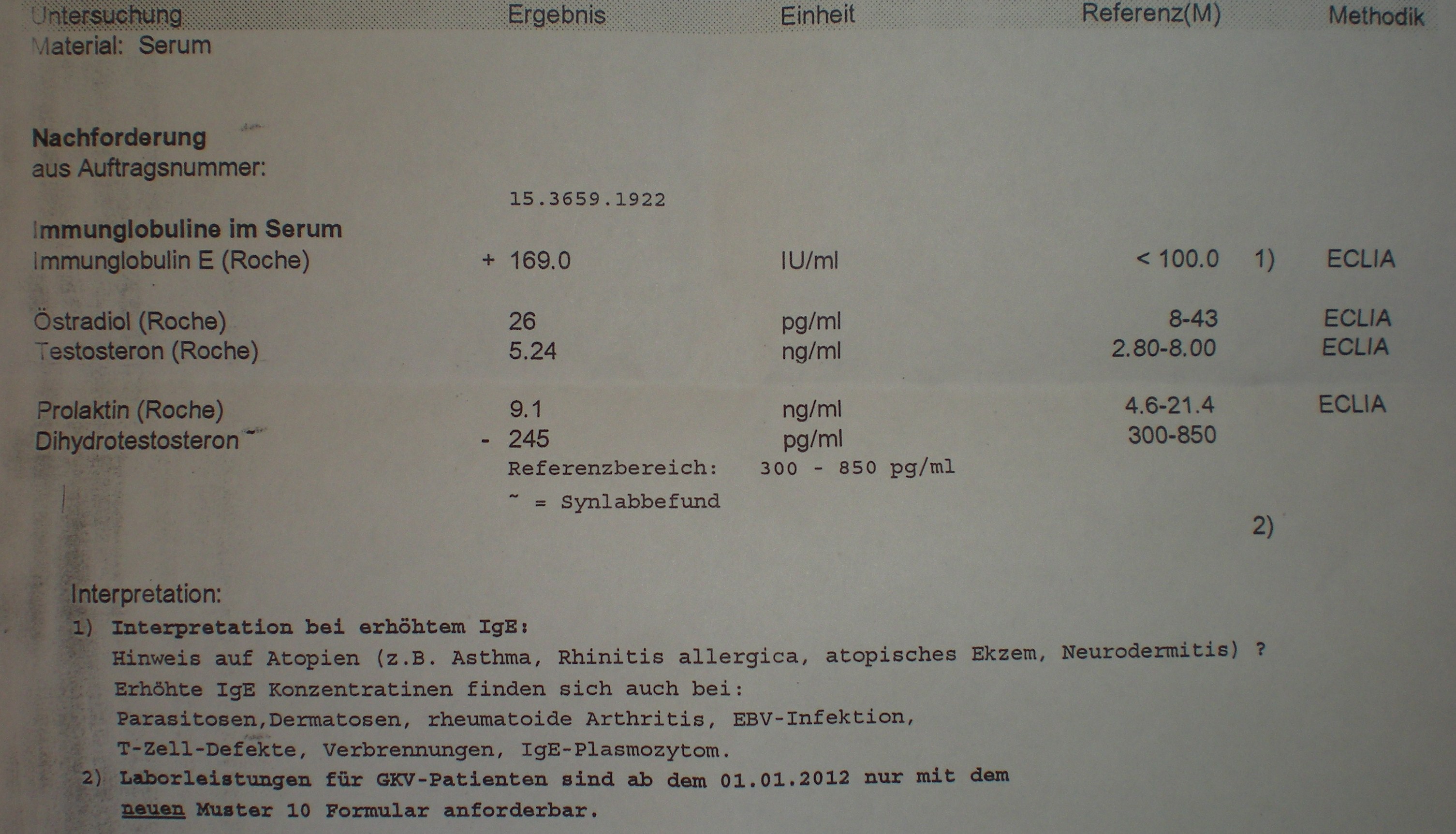 So, wie gestern bereits angekündigt, findet ihr im Anhang die aktuellen Hormonwerte. Ja, ich weiß, man hätte können noch andere bestimmen lassen, mehr konnte ich bei meiner KK aber wirklich nicht kostenfrei rauskitzeln Wink Es ging mir nicht darum, irgendwelche Trigger für AGA zu finden, sondern zu sehen, wie FIN topisch wesentliche Werte beeinflusst (sprich, T, DHT und E).