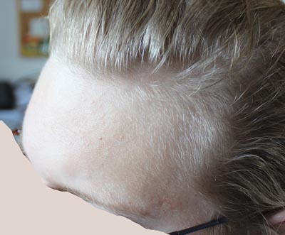 Volumen wär noch da ... Haarlinie wird rekonstruiert .. 1-2 cm Haare sind unterwegs .. man sieht es bei dem etwas verschwommenen Bild, das die Front links seitlich noch eher licht ist ;-/ aber in der Anzahl fast alles zurück ist .....