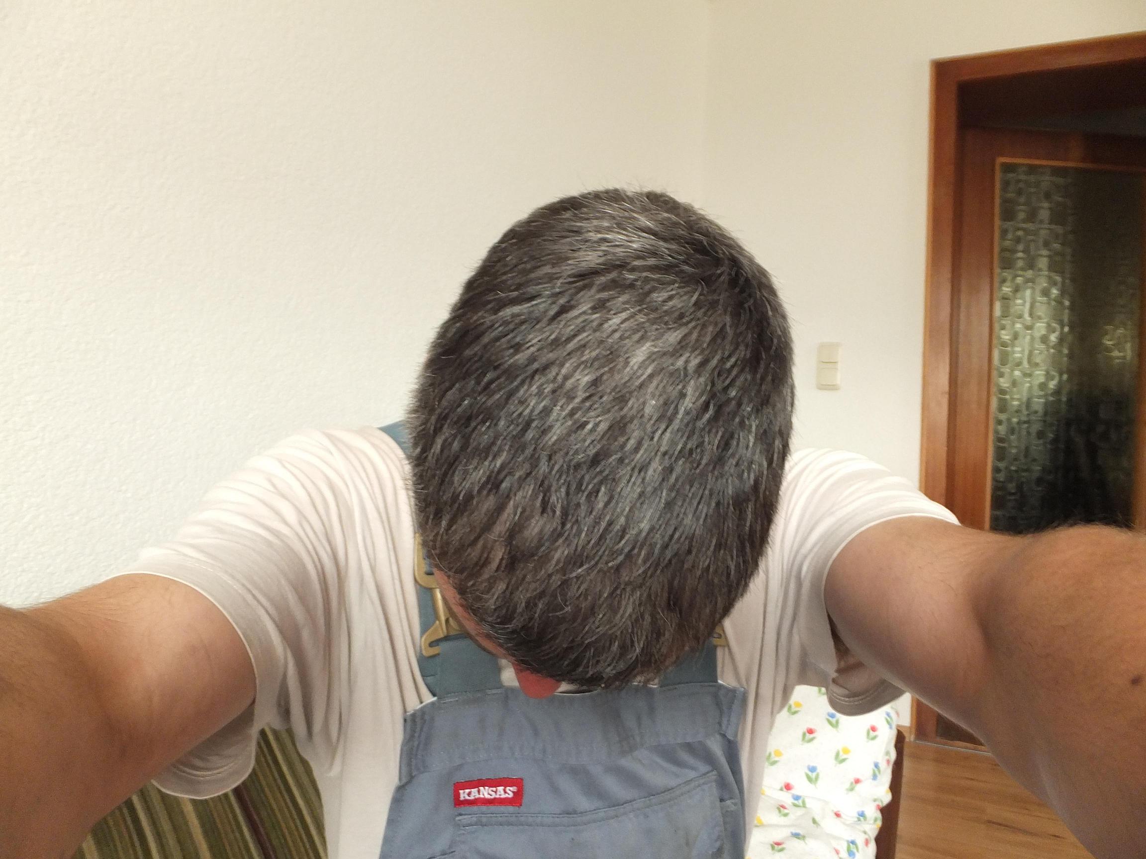 vorne sieht man eindeutig, das ich so eine Art Stirninsel gebildet hat. das war im Winter diesen Jahres noch alles dicht. man sieht auch, das ich sehr ergraue, was ich aber ertragen kann. Lieber Grau als mau! Bin jetzt in der 4. Woche mit dem Foam, welcher mir schon mal sehr geholfen hat. Habe auch noch flüssiges Minox zu Hause, das original regain. Ich weis allerdings noch nicht, ob ich es verwenden werde, das ich stark mit schuppenbildung reagiere. Mal sehen, ob ich das wieder dicht kriege, was mir vor allem etwas sorgen bereitet, ob es dann bei grauem Haar noch funktioniert. bin bestimmt in 3-4 Jahren richtig grau!