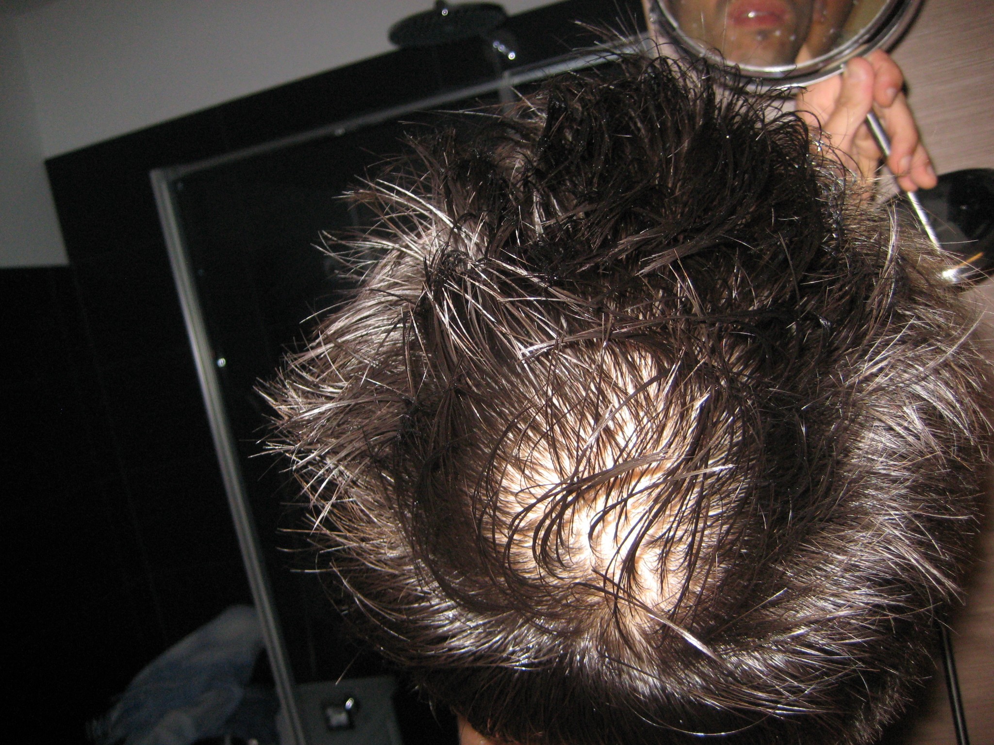 Ich kanns immer noch sehr gut verstecken, hab sehr dichtes und volles Haar am Rest vom Kopf, aber eine merkbare Ausdünnung am Oberkopf auf relativ grosser Fläche. Sehr geringe GHE...