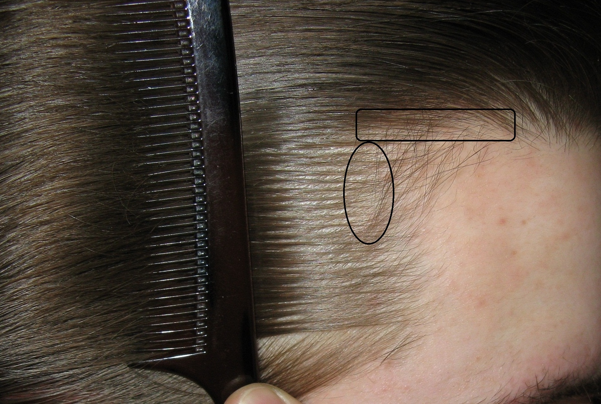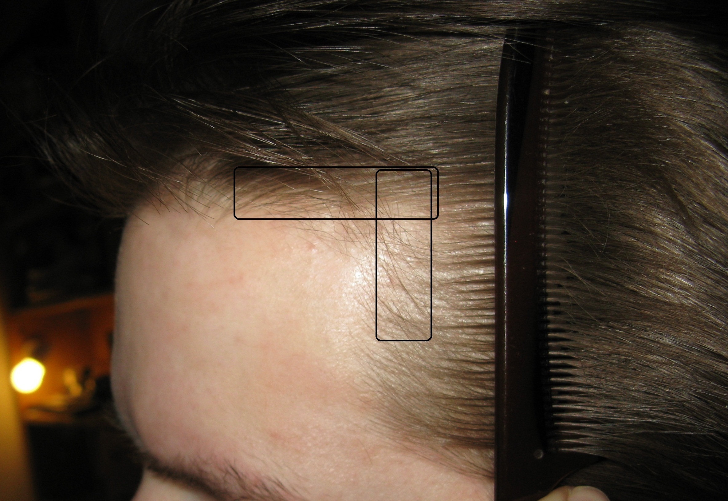Im Anhang noch 2 Bilder (gleiche Zeit wie die anderen mit 19,5), dann ist glaub ich genug gezeigt. (Form war immer schon so, nur sind da einige Haare miniaturisiert, die es jedenfalls mal nicht waren. beim Bild von rechts ist die ursprüngliche "Linie" eingerahmt- wo es früher eben etwas dichter war und die kindliche Velluslinie noch war, von der nur noch einzelne Härchen erkennbar sind- unter dem markierten Bereich)