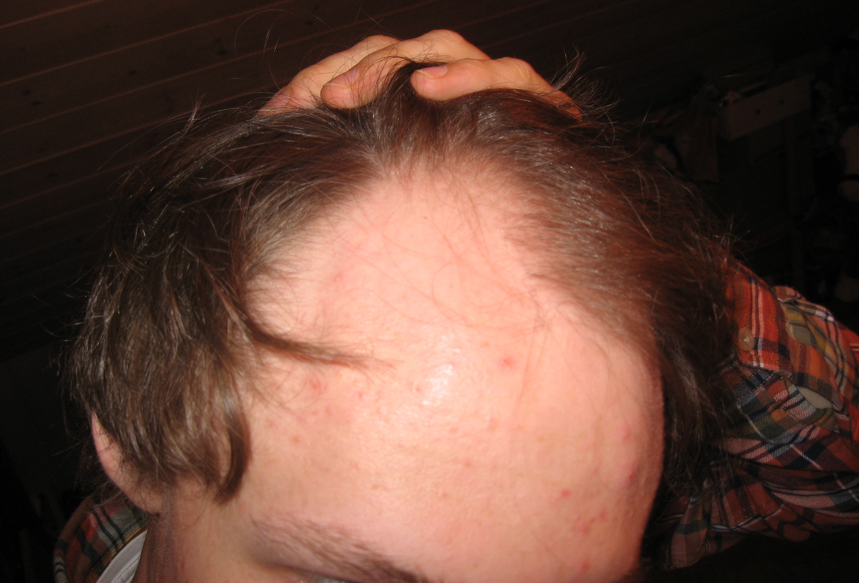 Hatte schon immer eine hohe Stirn (schon als 13 Jähriger), sowie schlechte Anlagen aus der Familie.